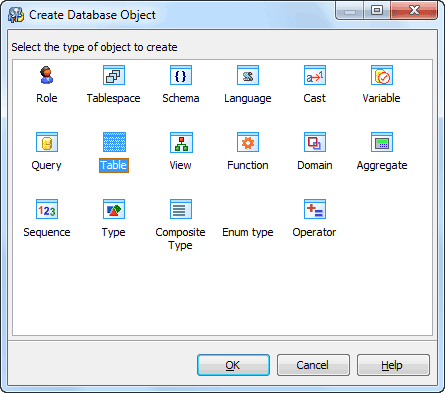 The Create Database Object dialog allows you to create any type of database object supported by PostgreSQL Maestro. To open the dialog select the Object | Create Database Object... main menu item or use the Shift+Ctrl+N hot keys combination. Select an object type icon and click the OK button to invoke the corresponding wizard or dialog.