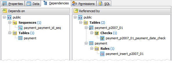 When you create complex database structures involving many tables with foreign key constraints, views, triggers, Functions, etc. you will implicitly create a net of dependencies between the objects. For instance, a table with a foreign key constraint depends on the table it references. We tried to create a software to make your work easier, i.e. to give you the tools for efficient database objects management. The Dependencies tab allows you to control the correlation of objects efficiently.