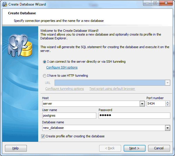 Set the connection properties of the new database. If the Create profile after creating the database option is checked, the Edit Database Profile dialog is opened after the new database is created.