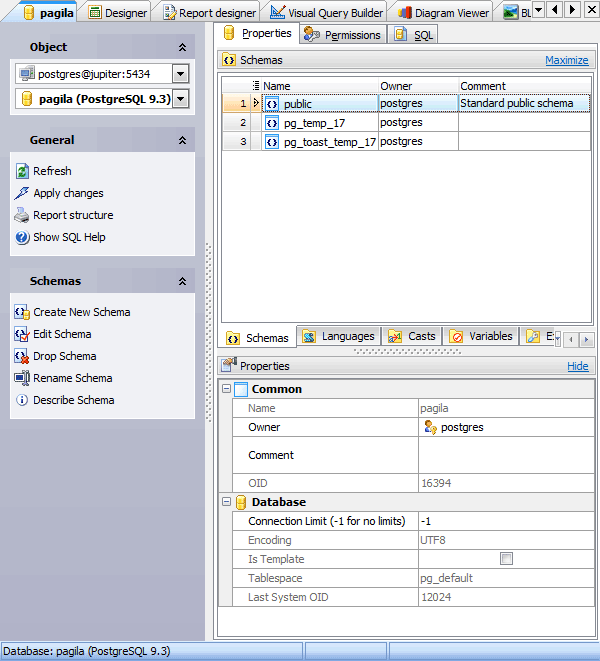 Every tab is intended for managing corresponding database objects (e.g. tables, views, queries, etc.). Open the object in its editor by double-clicking or pressing the Enter key. The popup menu allows you to create new, edit or drop the selected database objects. Using this menu you can also create a copy of the object.