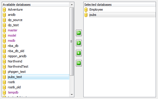 To create a new profile, select databases to be registered by moving them from the Available databases list to the Selected databases list. This step is available if the Create a single profile option is unchecked on the previous wizard step.