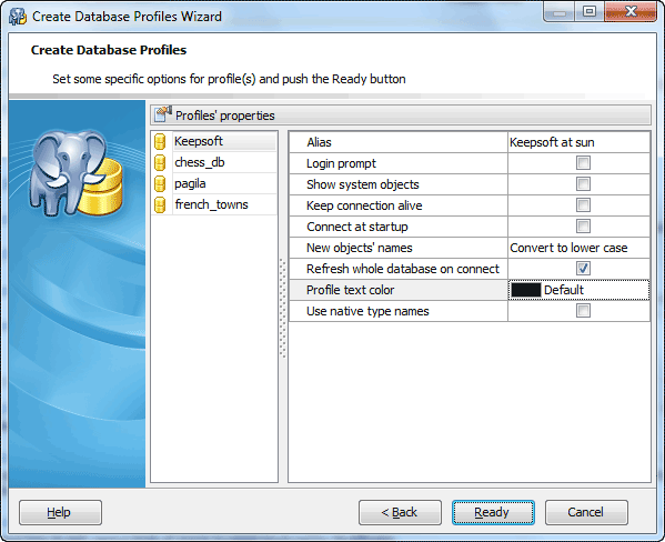 Click the Ready button when done to start working with the selected databases in PostgreSQL Maestro.