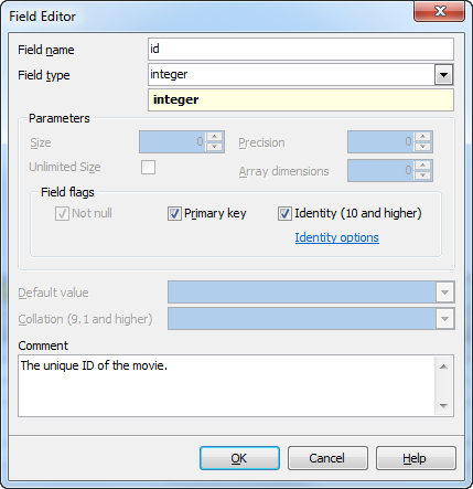 Table columns and composite type fields are created and edited within the Field Editor. The information below are useful for editing of table fields. Composite types' fields admit to editing the comment only.