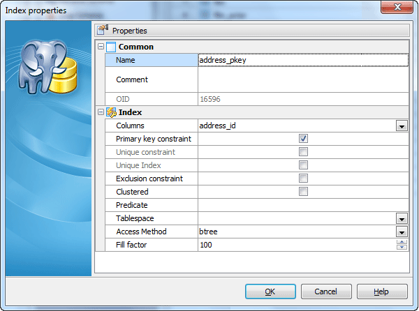 Use the Columns drop-down list to select a key field(s) for the index. Specify the index sort order and Nulls order (First means the index sorts nulls before non-nulls, Last - conversely).
