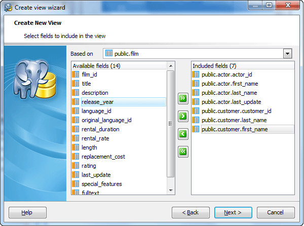 Select a table or a view from the Based on drop-down menu. Then specify which fields will be used in the new view. Use Add All or Add Selected buttons to include field(s) into view definition. Use the Remove Selected or Remove All items to exclude field(s) from the view's field list. Click the Next button to proceed.