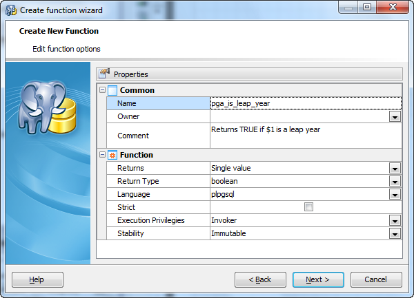 At this step you can specify the SQL definition for the new function. The step is optional: you can do it later using a non-modal editor.