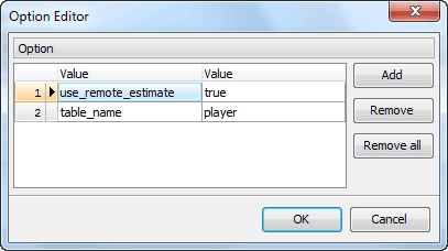The Options dialog allows to set options to be associated with the new foreign table or one of its columns. The allowed option names and values are specific to each foreign data wrapper and are validated using the foreign-data wrapper's validator function. Duplicate option names are not allowed (although it's OK for a table option and a column option to have the same name).