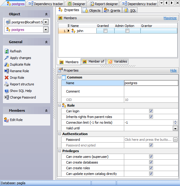 Role Editor is the basic PostgreSQL Maestro tool for working with existing roles. It can be opened automatically after the role is created and is available on editing the role (see How to edit role for details).