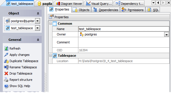 Tablespace Editor allows you to browse options of existing tablespaces and change some of them. The editor can be open automatically after the tablespace is created and is available on editing the tablespace (see How to edit tablespace for details) or from the corresponding node of Explorer Tree or Object Manager.