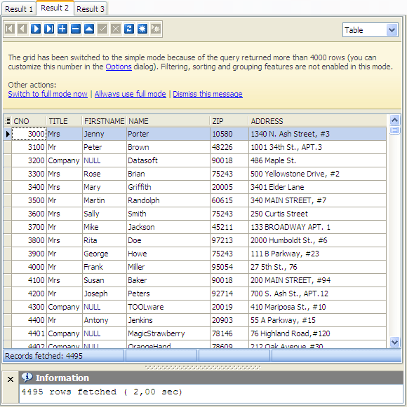 | • | the simple grid mode is provided for working with large number of records. For speed-up data fetching, filtering and sorting abilities are not enabled in this mode. The notification bar at the top of the grid (see the picture below) announces that the grid has been switched to the simple mode. |