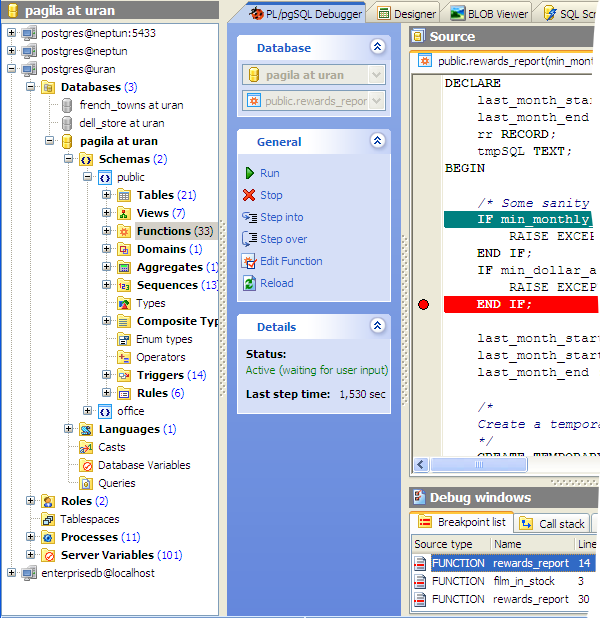 The PL/pgSQL Debugger tool allows you to debug PL/pgSQL functions written on PL/pgSQL using traditional debugging features such as setting breakpoints, viewing variable values, and examining the call stack.