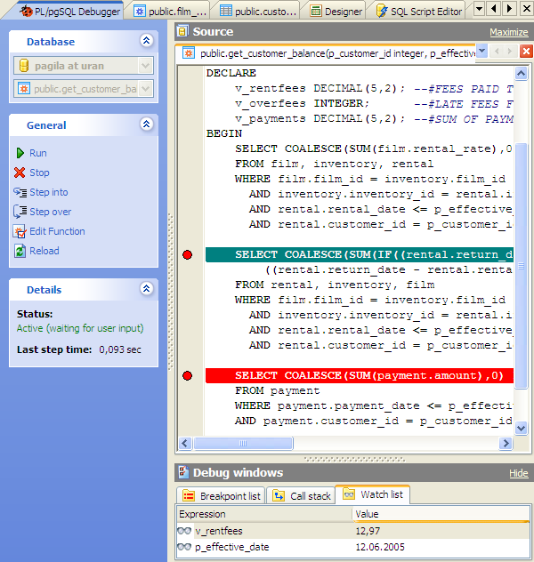 For those programming errors that are really hard to track, PostgreSQL Maestro provides an integrated PL/pgSQL debugger. The main principles of the debugging process within the PL/pgSQL Debugger are similar to the same tools methods.
