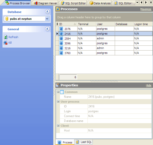 Process Browser is very useful tool for DBAs who want to monitor the users' activity (in fact, there are potentially thousands of sessions in a database at any one time). You can view details for each session (such as login, connect time, database name, client host, last SQL statement executed and more) as well as group and filter processes by client host, connected user, database, client application, etc.