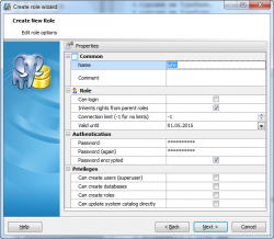 Create User/Role Wizard allows you to specify all the principal properties and privileges as well as set up his membership and environment. The corresponding Editor is provided to edit all the existing principal information; you can also find there the list of his own objects.