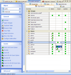 PostgreSQL Maestro allows managing access privileges (Grants) for PostgreSQL users and groups in the simplest way.