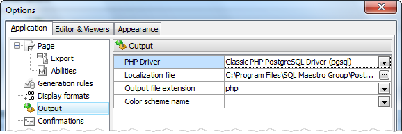 There are several PHP drivers to communicate with database servers and PostgreSQL PHP Generator allows you to select a driver to be used by the generated web application. Note that the corresponding set of PHP functions should be available on your web server.
