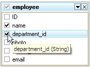 To include all the table fields, tick off the option box to the left of the table caption. In case none fields is included, the SQL statement is generated as SELECT * FROM <Table_Name>, i.e. all the fields are selected. To remove the fields from the query, uncheck the corresponding boxes. |