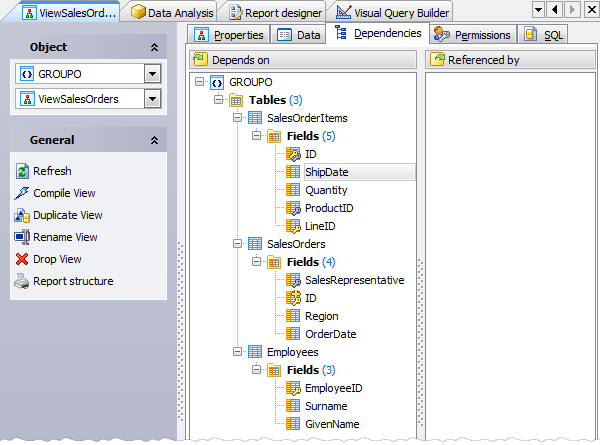 The Referenced by window contains the tree of database objects constituting the dependency relationship on the current object.