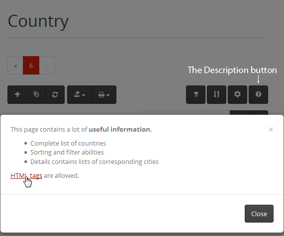 If specified, the generated webpage is equipped with a button with a question mark on the right side of the title bar of the page. This button opens a modal window with the specified description. HTML tags are allowed.