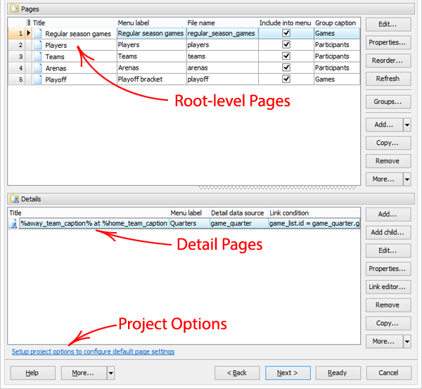 The working area of this step is divided into two main sections: root level pages (i.e. pages to be included into the site menu) and detail pages that are covered in the appropriate topics.