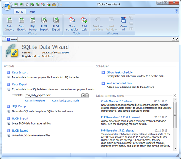 This way is useful if you already have a template which does not require further customizing. To supply a wizard with all the session parameters from a template file and execute it in background mode, specify a template file at the Home page and click Run in background mode. Besides, you can specify a time to execute the task within the Task Scheduler.