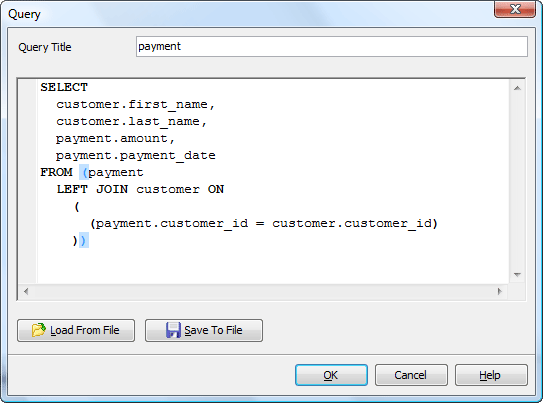 To use a custom SQL query as a data source, use the Create query button and enter the query name and a SELECT statement. It is also possible to load a query from an .sql file.