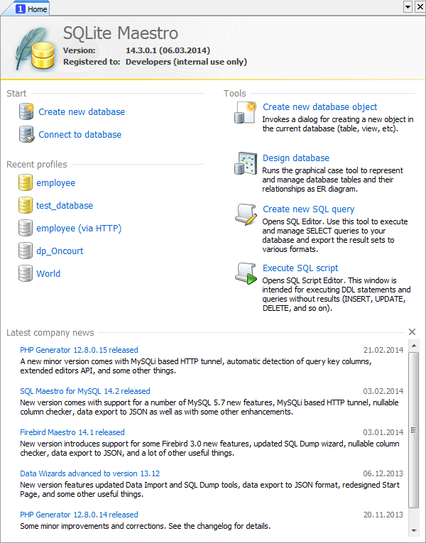 The window provides you with quick access to the Create Database Object dialog, Schema Designer, SQL Editor, and SQL Script Editor recently used database profiles. At the bottom of the page the latest company news and current discount programs are represented.