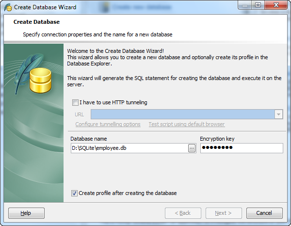 Set the connection properties of the new database. If the Create profile after creating the database option is checked, the Edit Database Profile dialog is opened after the new database is created.