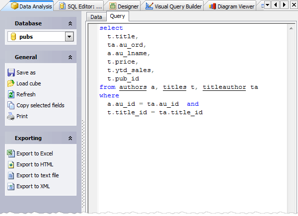To get an OLAP cube, enter SELECT query as a snowflake schema, represented by centralized fact tables (with numeric data) which are connected to multiple dimensions (the numeric data to be categorized by). Input the query text in the SQL Editor area directly or use "drag-n-drop" operation SQL Editor or Visual Query Builder areas and the Query tab of Data Analisis.