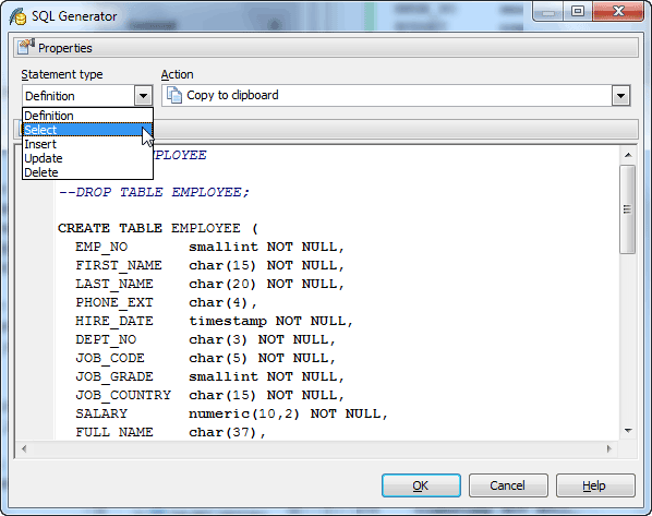 Among other features SQLite Maestro provides you with SQL Generator, a tool to create simple SQL statements. Just choose a database object, select statement type (Definition, Select, Insert, Update, or Delete) and the destination device (Clipboard, File, SQL Editor, SQL Script Editor).