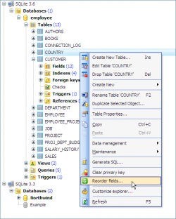 The Database Explorer field occupies the left side of SQLite Maestro main window. Use it to create new database objects, duplicate, rename and open object editors. The explorer also provides quick view of object properties available through the corresponding popup menu item. |