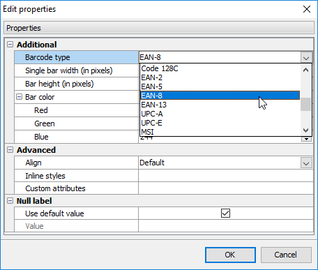 • Support for Barcodes has been added (requires php 7.0 or higher). This view control allows you to represent string data as symbols that can be scanned electronically using laser or image-based technology. This version introduces 30 types of the most popular barcodes including UPC/EAN codes, Code 39, Code 128, and Postnet. The ability to set the foreground color makes it possible to use Barcodes in dark color schemes.