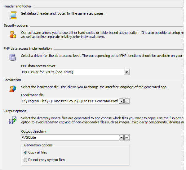 There are several PHP drivers to communicate with database servers and SQLite PHP Generator allows you to select a driver to be used by the generated web application. Note that the corresponding set of PHP functions should be available on your web server. By default the driver is set in accordance with the application output options.