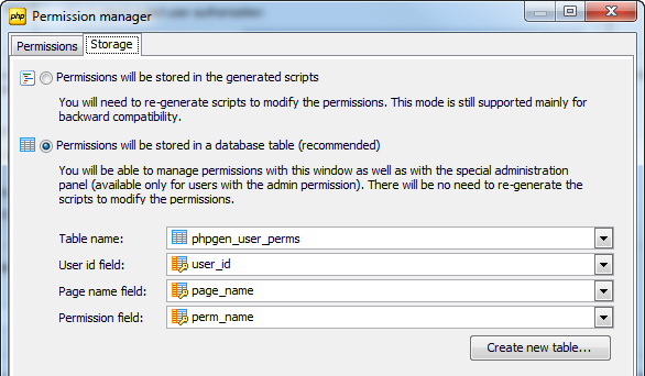 On using this kind of authorization, user accounts are always stored in a database table while permissions can be stored either in the generated files (as on using the hard-coded authorization) or in a database table like user accounts (recommended). To choose between these options, switch to the Storage tab and click the appropriate radio button.