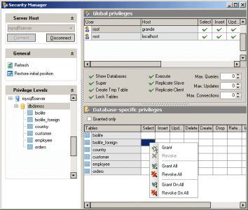 In order to define view, user needs to get permission to invoke the CREATE VIEW command from database owner and have corresponding access to all tables and views that are used in defining that view. Applying MySQL Maestro's Security Manager, DBAs can easily set privileges. Permission management to new MySQL objects is also implemented in MySQL Maestro. That is making MySQL server administration very simple and comfortable.