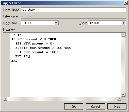 Work with triggers can be simplified with the help of MySQL Maestro's Trigger Editor. This editor allows you to set up trigger properties when you add or edit a trigger. Editing triggers isn't standard for MySQL because there is no ALTER TRIGGER statement, but it is implemented in MySQL Maestro.